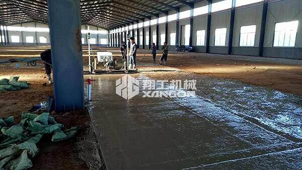 在手扶混凝土攤鋪機(jī)整平頭有用的施工范圍內(nèi),首先人工將混凝土初平至比地坪標(biāo)高高1-2㎝(具體高度依混凝土坍落度而定),然后用手扶混凝土攤鋪機(jī)一次性完成振搗、壓實(shí)、整平工作。
